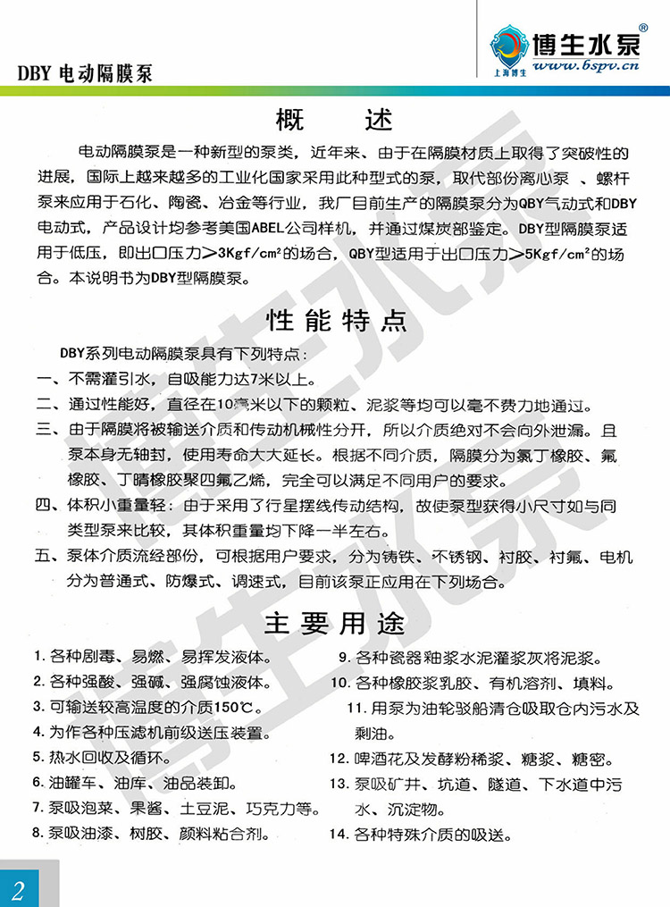 博生公司生產(chǎn)的上海博生DBY-15型電動(dòng)隔膜泵是一種新型的泵種,近年來(lái),由于在隔膜材料取得了突破性的進(jìn)展,國(guó)際上越來(lái)越多的工業(yè)化國(guó)家要用此種型式的泵,上海博生DBY-15型電動(dòng)隔膜泵代替部份離心泵、螺桿泵,來(lái)應(yīng)用于石化、陶瓷、冶金等行業(yè)。